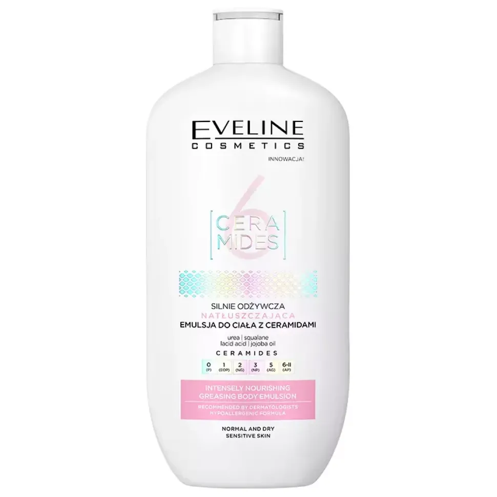 Hipoalergiczna emulsja do ciała z serii 6 Ceramides to silnie odżywiający i natłuszczający kosmetyk, który zawiera w swoim składzie ureę, skwalan, kwas mlekowy i olejek jojoba. Emulsja dostarcza ciału intensywne nawilżenie, odżywienie i ukojenie.