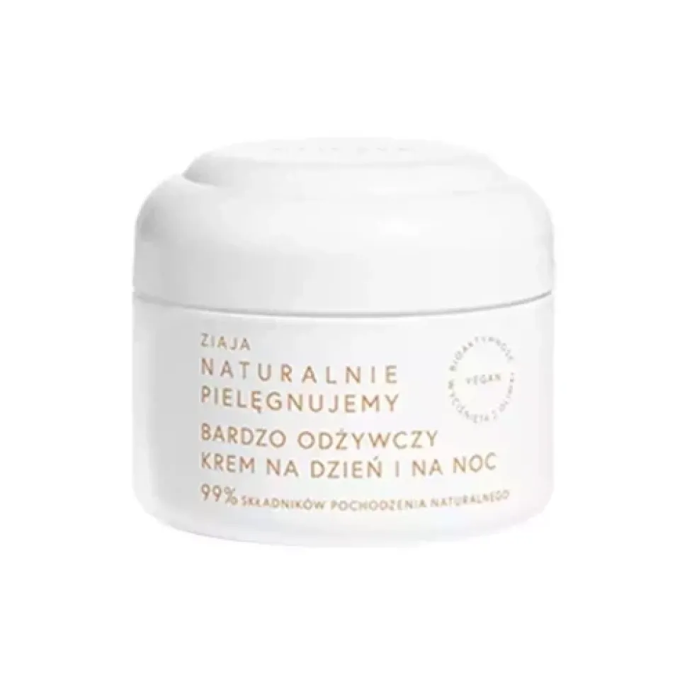 Bardzo odżywczy krem do twarzy na dzień i na noc Ziaja Naturalnie Pielęgnujemy to wyjątkowy kosmetyk do pielęgnacji każdego rodzaju skóry. Innowacyjna, roślinna receptura kosmetyku zawiera doskonałe połączenie składników aktywnych, które w ciągu dnia i nocy głęboko nawilżają, odżywiają i regenerują cerę. Oliwkowa aktywności fitosteroli, tokoferoli i lipidów oraz roślinnych sterolach z oleju canola i masła shea skutecznie poprawia wygląd i kondycję skóry sprawiając, że staje się wspaniale wygładzona, wypielęgnowana i aksamitnie miękka w dotyku. Krem także łagodzi i koi wszelkie podrażnienia, dzięki czemu odzyskuje swój naturalny, zdrowy wygląd. Dodatkowo chroni ją przed nadmiernym przesuszaniem i wzmacnia barierę hydro-lipidową, przez co jest bardziej odporna na negatywny wpływ czynników zewnętrznych.