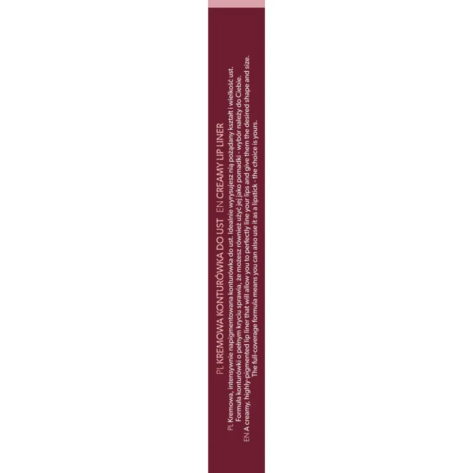 Kremowa, intensywnie napigmentowana konturówka do ust. Idealanie wyrysujesz nią pożądany kształt i wielkość ust. Formuła konturówki o pełnym kryciu sprawia że możesz również użyć jej jako pomadki, wybór należy do Ciebie.