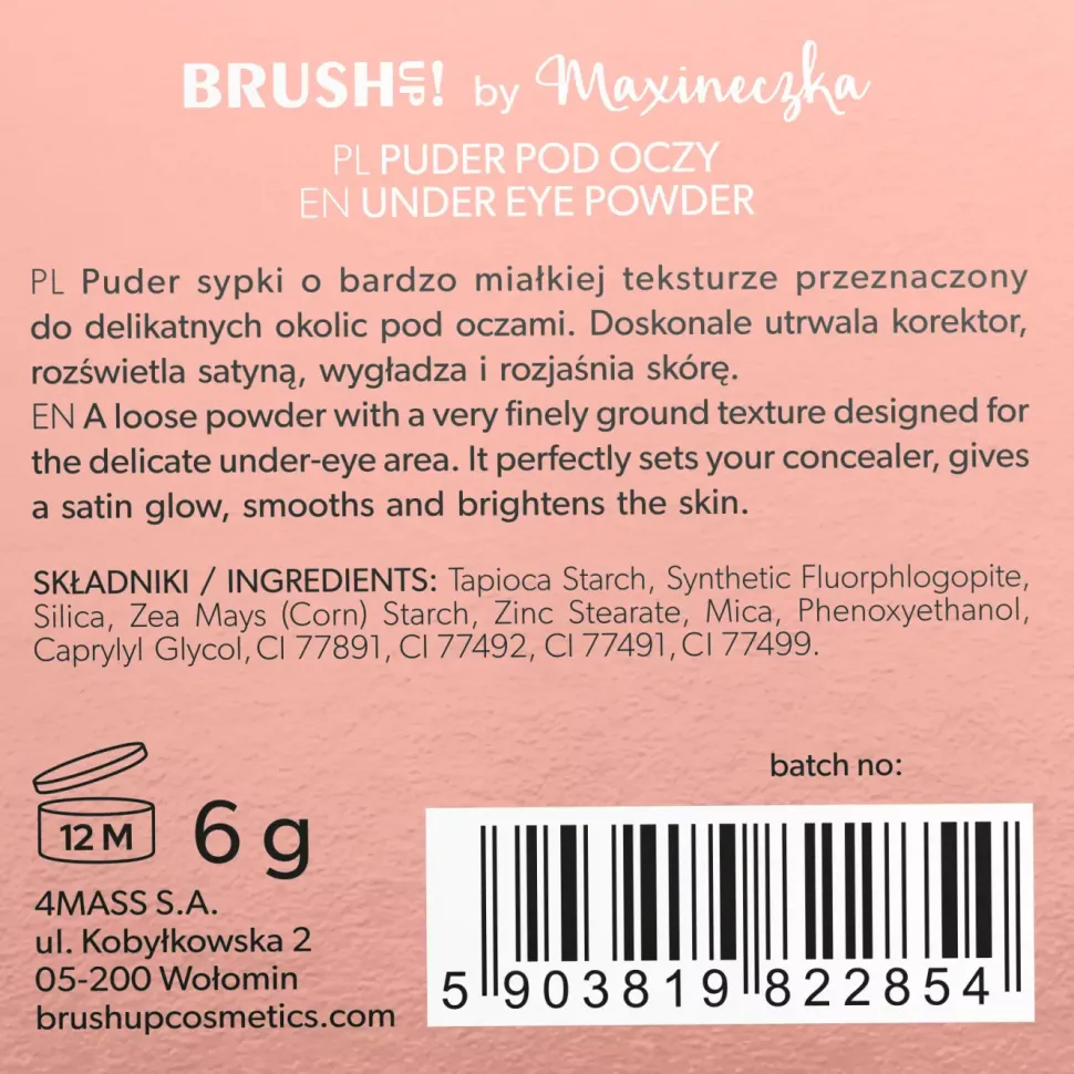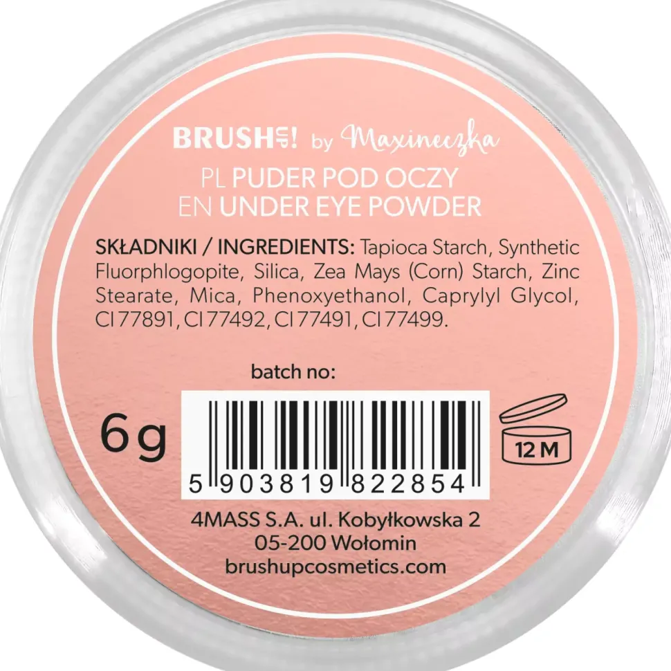 BRUSH Up! by Maxineczka Under Eye Powder to puder pod oczy, który zapewni Ci idealne wykończenie makijażu oczu. Ten delikatny puder sypki, o bardzo miałkiej teksturze, został stworzony specjalnie do okolic pod oczami, aby zapewnić im perfekcyjne wykończenie i wyładzenie.