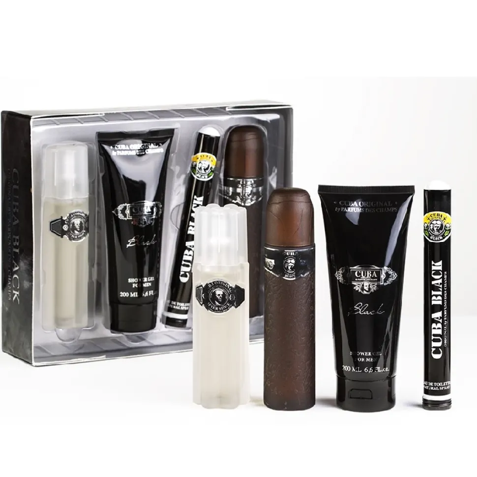 Zestaw męskich kosmetyków z linii Cuba Black Men od cenionej marki Cuba Original. Zawiera: wodę toaletową w 2 pojemnościach (100ml i 35ml), żel pod prysznic 200ml i wodę po goleniu 100ml.