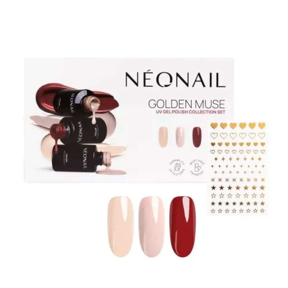 Golden Muse to zestaw lakierów hybrydowych z dodatkiem złotych naklejek o metalicznym połysku. Zawiera 3 limitowane kolory w kompaktowej wersji 3 ml, niedostępne w regularnej sprzedaży. Jest idealny dla ciepłych tonów cery.