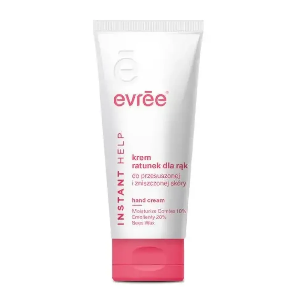 Evree Instant Help Krem na ratunek dla rąk – przesuszona i zniszczona skóra Stworzony z myślą o codziennej, skutecznej pielęgnacji wymagających dłoni. Formuła oparta na starannie dobranych składnikach aktywnych działa jak kojący opatrunek, przynosząc natychmiastową ulgę i intensywną regenerację. Krem sprawdza się idealnie w sytuacjach, gdy dłonie są narażone na działanie niekorzystnych czynników zewnętrznych: chłodu, detergentów czy częstego mycia.