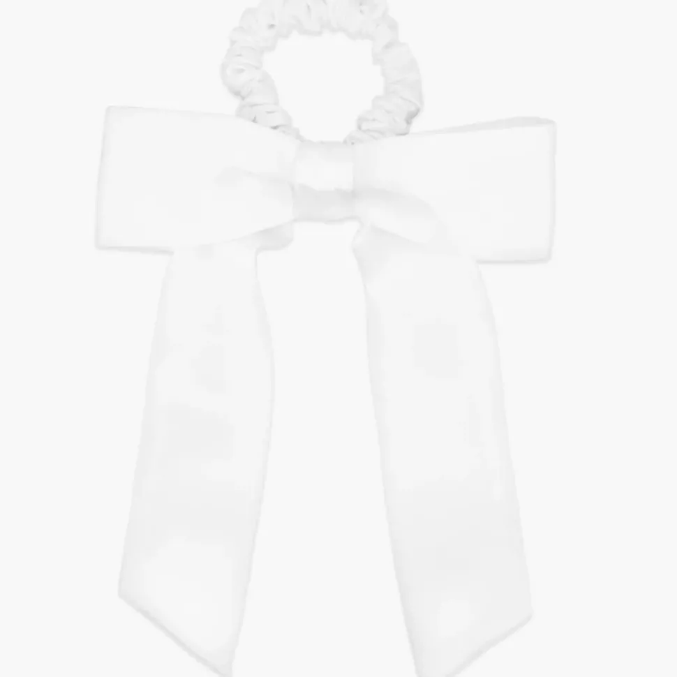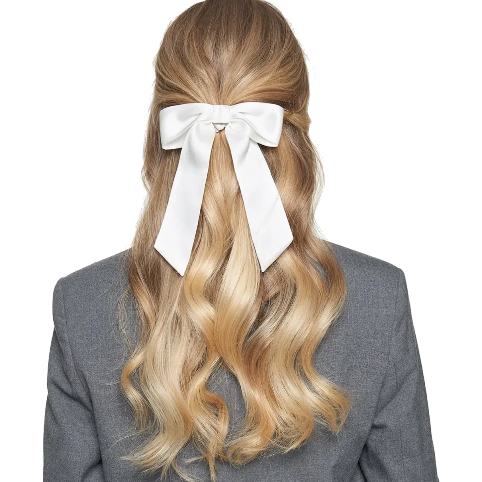 Klasyczna, satynowa kokarda zamocowana na gumce do włosów. Wykonana z jedwabiu w kolorze kości słoniowej posiada prostą ozdobną wstążkę. Zamocowana została na delikatnej, jedwabnej gumce więc nie szarpie, nie łamie i nie wyrywa włosów.