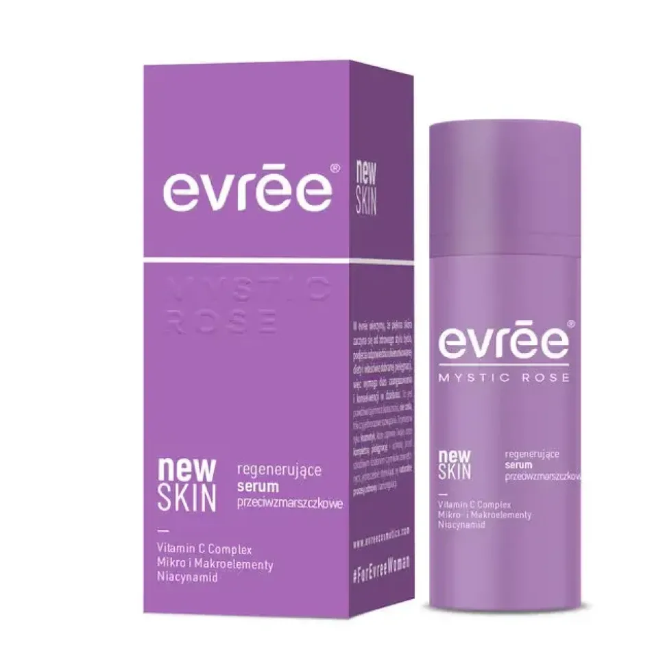 Evree Mystic Rose New Skin Regenerujące serum przeciwzmarszczkowe do twarzy Wieczorna pielęgnacja to czas, kiedy Twoja skóra zasługuje na intensywną regenerację. Evree Mystic Rose New Skin to nocne serum odbudowujące, które działa w rytmie biologicznej odnowy skóry. Stworzone z myślą o kobietach narażonych na szkodliwy wpływ środowiska, smogu, stresu i promieniowania UV, intensywnie wspiera regenerację naskórka, ujędrnia, wyrównuje koloryt oraz niweluje oznaki zmęczenia i starzenia.