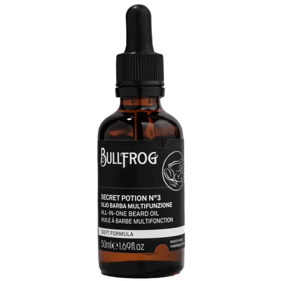 Secret Potion N°3 wielofunkcyjny olejek do brody to niezastąpiona sekretna formuła fryzjerów Bullfrog, idealna do uzyskania nieskazitelnego golenia i do odżywiania wszelkiego rodzaju brody, dzięki lekkiej konsystencji. Wielofunkcyjny olejek, który może być stosowany zarówno jako kuracja przed goleniem i jako wykończenie, aby broda była bardziej miękka i mniej pusząca. Przyjemna, miękka formuła o bardziej suchej konsystencji, która łączy w sobie ekstrakt z opuncji figowej, olej słonecznikowy, olej jojoba, ekstrakt z rozmarynu i olej z kiełków pszenicy, aby odtworzyć bogatą, ale lekką kompozycję. Zapach wybrany dla tego produktu to Eau de Parfum Secret Potion N.3, który odznacza się ziemisto-piaszczystym aromatem.