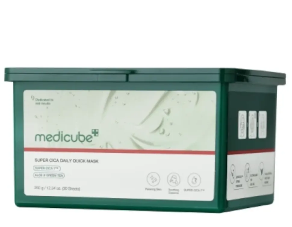 Medicube – Super Cica Daily Quick Mask – zestaw trzydziestu maseczek w płachcie o właściwościach łagodzących i kojących skórę.