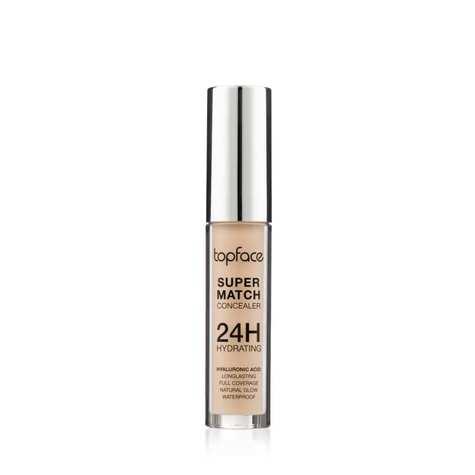 24 – godzinne nawilżenie i doskonały efekt kamuflażu… Korektor TopFace Super Match Concealer 24H, wzbogacony kwasem hialuronowym i witaminą E zapewnia pełne krycie. Natychmiast dopasowuje się do skóry dzięki doskonałym właściwościom kamuflażu. Podkreślając naturalny blask cery pomaga ukryć niedoskonałości pod oczami i zapewnia żywy wygląd. Jest wodoodoporny. Twój makijaż będzie wyglądał świeżo i nieskazitelnie przez długi czas dzięki wyrównaniu kolorytu skóry. Jego formuła, którą łatwo i szybko się aplikuje, kryje cienie pod oczami i zapewnia rozświetlające wykończenie.