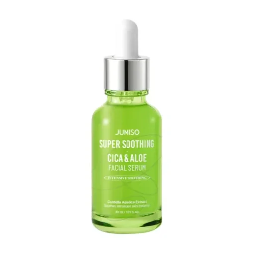 Jumiso Super Soothing Cica Aloe Facial Serum 30ml Silnie skoncentrowane serum nawilża i koi skórę narażoną na niekorzystne skutki wahań temperatury, zanieczyszczonego powietrza i codziennych stresorów. Produkt zawiera 41% ekstraktu z Centella asiatica – silnego składnika mającego na celu odbudowę skóry oraz 31% ekstraktu z liści Aloe Vera, który jest w stanie dogłębnie nawilżyć skórę i odbudować jej mechanizmy obronne. Kompleks 7 rodzajów kwasu hialuronowego zapewnia zatrzymanie wilgoci w skórze w ciągu dnia, a kompleks 17 rodzajów aminokwasów chroni barierę skóry i poprawia jej elastyczność.