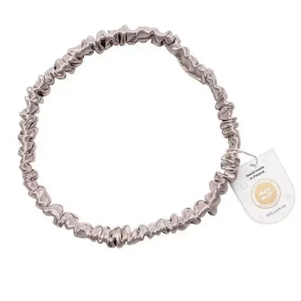 Szeroka elastyczna opaska jedwabna w kolorze różowego złota. Gumka wewnętrzna dopasowuje się do kształtu głowy i jest komfortowy w noszeniu. Posiada ozdobne marszczenia. Idealna do codziennych stylizacji jak i do podtrzymania włosów podczas zabiegów kosmetycznych. Jedwab jest delikatny dla włosów i skóry. Wyprodukowano w Polsce.