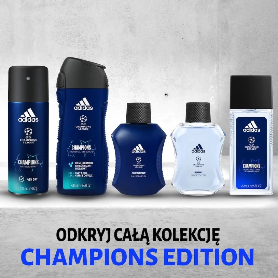 Marka adidas przedstawia Champions Edition, oficjalną linię zapachów i produktów do pielęgnacji ciała stworzoną we współpracy z UEFA Champions League. Ta wyjątkowa kolekcja jest inspirowana duchem sportowej rywalizacji i przeznaczona dla entuzjastów piłki nożnej. Należące do linii produkty zapewniają ochronę zarówno w trakcie przygotowań do meczu, jak i po rozgrywce, a także podczas euforycznego świętowania i spotkań poza boiskiem. Odświeżają oraz potęgują radość i ekscytację. Są idealne dla tych, którzy w życiu kierują się zasadami pięknej, prawdziwie sportowej rywalizacji. Aby móc uzyskiwać doskonałe wyniki na boisku, należy zadbać o odpowiednie przygotowanie do gry i regenerację po jej zakończeniu. Poczuj orzeźwiającą świeżość i przypływ pewności siebie dzięki kosmetykom z linii Champions Edition. Spraw, aby każda podniosła chwila stała się jeszcze wspanialsza, dzięki nowym kosmetykom Champions Edition.