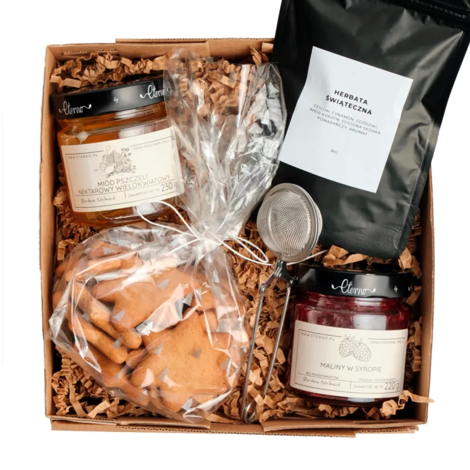 Zestaw prezentowy stworzony z myślą o nadchodzących świętach. Znajdziesz w nim zimową, cudownie pachnącą goździkami herbatę, miód, maliny w syropie, pyszne pierniki i zaparzacz. To wszystko zapakowane w prezentowe pudełko z kartką na której możesz napisać życzenia.Idealny set dla fanów herbaty, pracowników, bliskich czy przyjaciół.