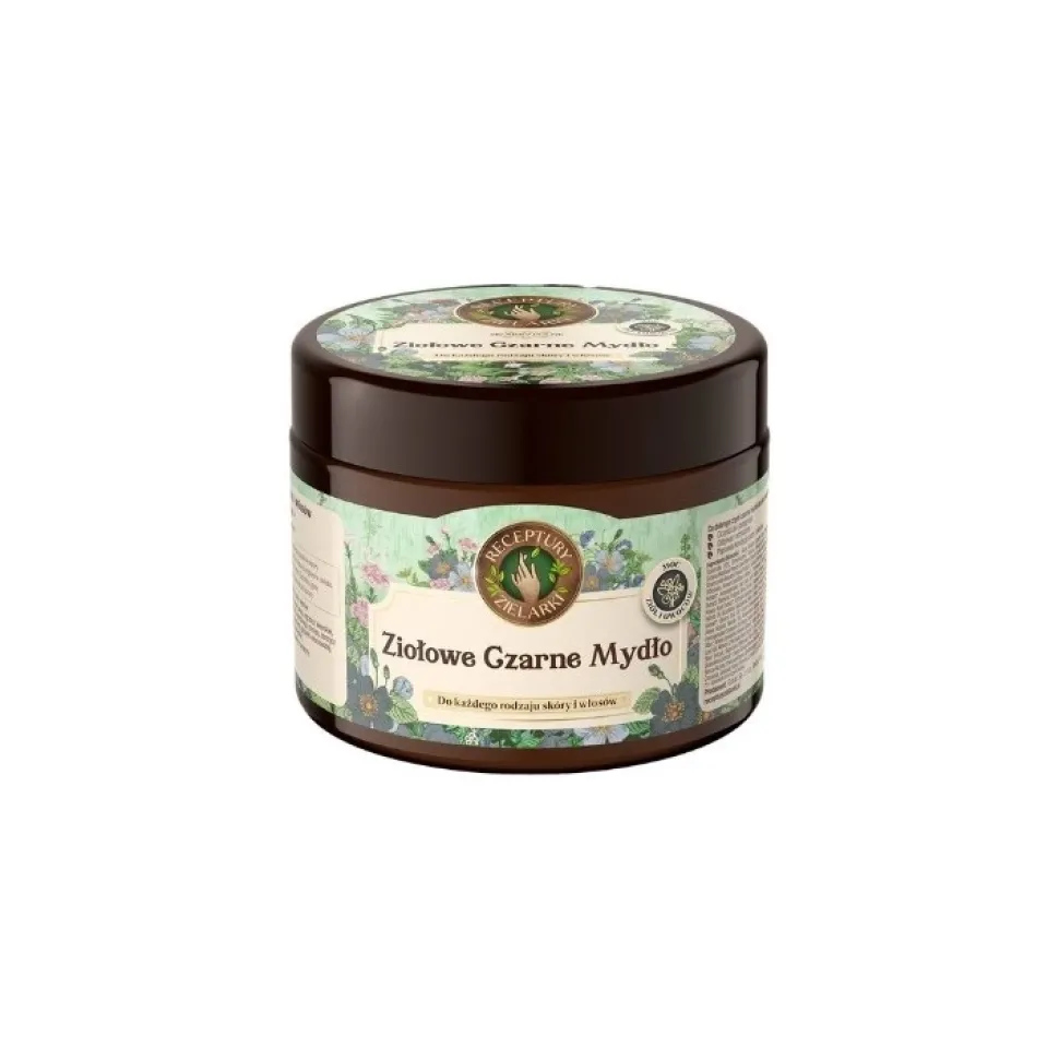 Receptury Zielarki Skarby Polne ziołowe czarne mydło do mycia ciała i włosów 37 polnych ziół 300 ml, które dogłębnie oczyszcza skórę i pasma z zanieczyszczeń. Pozbywając się cząsteczek brudu, pozostawia uczucie przyjemnej świeżości.