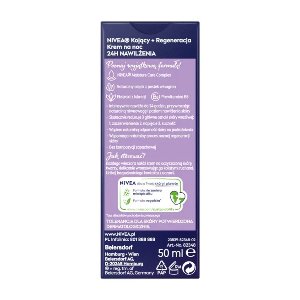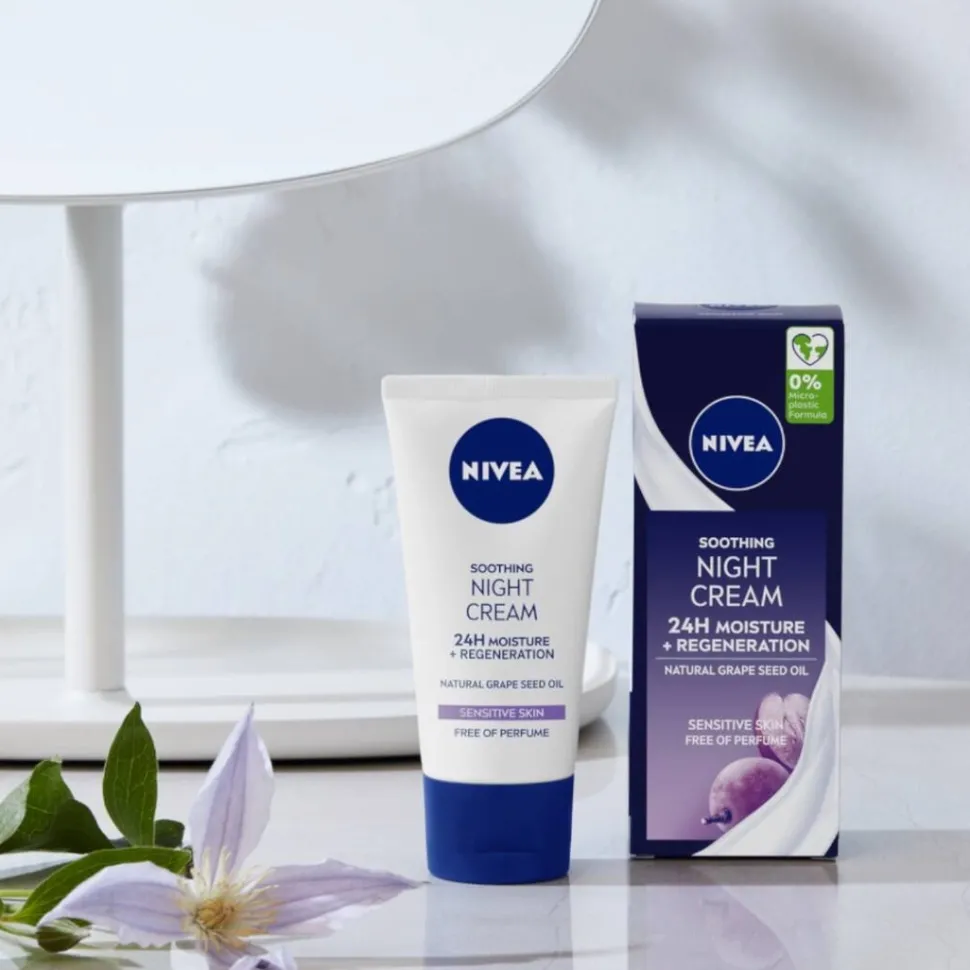 Łagodzący krem na noc NIVEA został opracowany z myślą o wrażliwej skórze. Poznaj wyjątkową formułę z olejkiem z pestek winogron, ekstraktem z lukrecji i prowitaminą B5, która intensywnie nawilża do 24 godzin, przywracając naturalną równowagę i poziom nawilżenia skóry, dzięki czemu wspomaga nocny proces regeneracji. Ponadto krem skutecznie redukuje 3 główne oznaki wrażliwej skóry – 1. zaczerwienienie 2. ściągnięcie 3. suchość. Tylko to, co najlepsze dla Twojej skóry! Tolerancja dla skóry potwierdzona dermatologicznie. NIVEA dba o Twoją skórę i planetę, Wegańska formuła nie zawiera mikroplastiku.