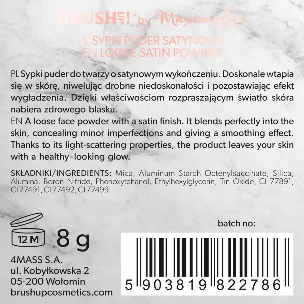 BRUSH Up! by Maxineczka Loose Satin Powder to puder satynowy, który doda Twojej twarzy naturalnego blasku i wygładzi jej powierzchnię. To doskonały puder do wykończenia makijażu, który zapewni Ci efekt idealnie wygładzonej cery.