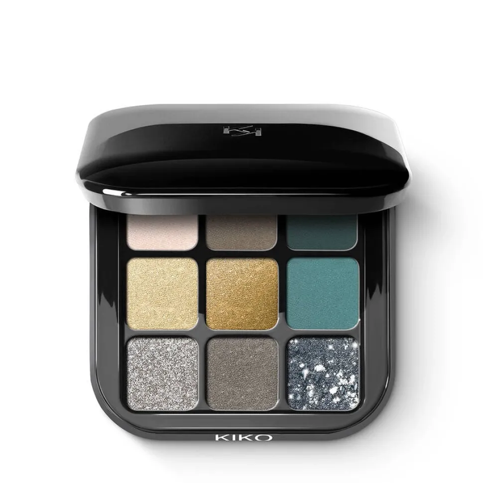 Paleta 9 cieni do powiek o różnym wykończeniu – matowym, perłowym, metalicznym, marmurkowym i brokatowym.