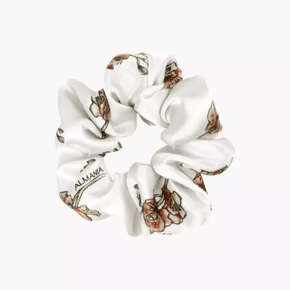 Wyjątkowo delikatna, satynowa gumka do włosów z jedwabiu w kolorze białym z motywem kwiatów. Nie szarpie, nie łamie i nie wyrywa włosów, jednocześnie utrzymując fryzurę w ładzie.
