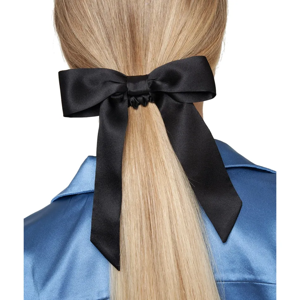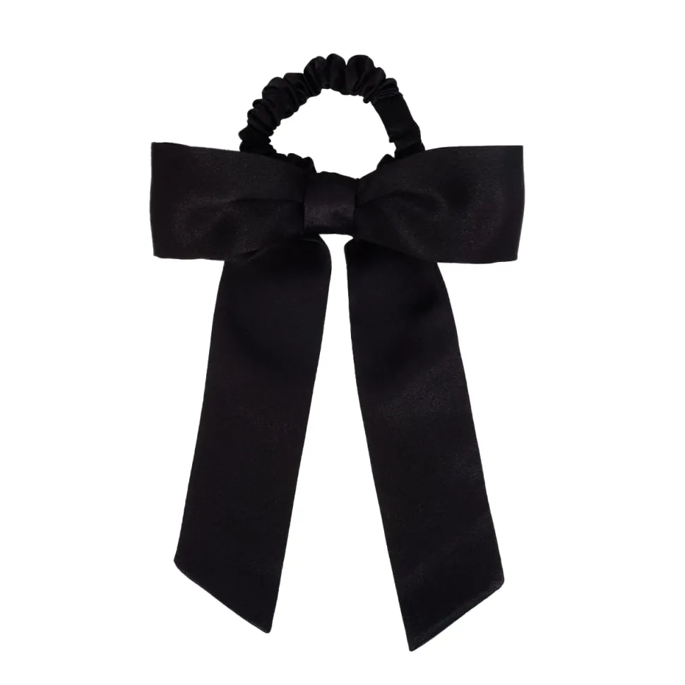Klasyczna, satynowa kokarda zamocowana na gumce do włosów. Wykonana z jedwabiu w kolorze kości słoniowej posiada prostą ozdobną wstążkę. Zamocowana została na delikatnej, jedwabnej gumce więc nie szarpie, nie łamie i nie wyrywa włosów.