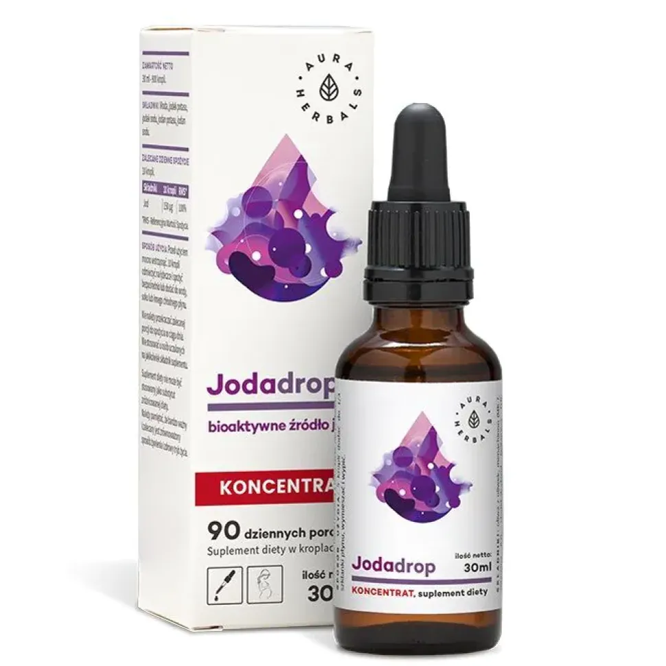 Aura Herbals Jodadrop – bioaktywne źródło jodu to preparat zawierający cztery związki jodu (jodek potasu, jodek sodu, jodan potasu, jodan sodu). Preparat składa się z cząsteczek wody oraz jodu nieorganicznego, czyli jodków – są one lepiej przyswajalne przez organizm i nie obciążają wątroby.