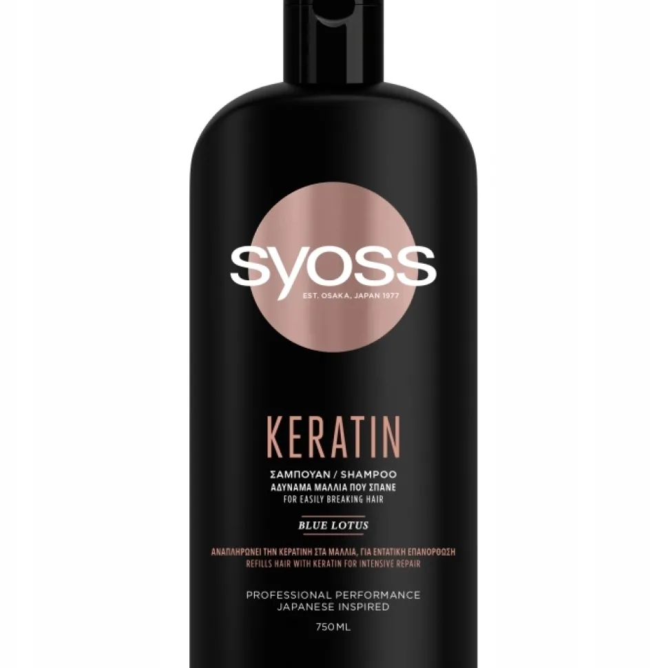 Szampon Syoss Keratin do włosów słabych i łamliwych. Formuła z kompleksem aminokwasów i kwiatem błękitnego lotosu uzupełnia strukturę włosów o keratynę, intensywnie je regenerując oraz wygładzając włókna włosów. Dla optymalnych efektów stosuj także odżywkę Syoss Keratin.