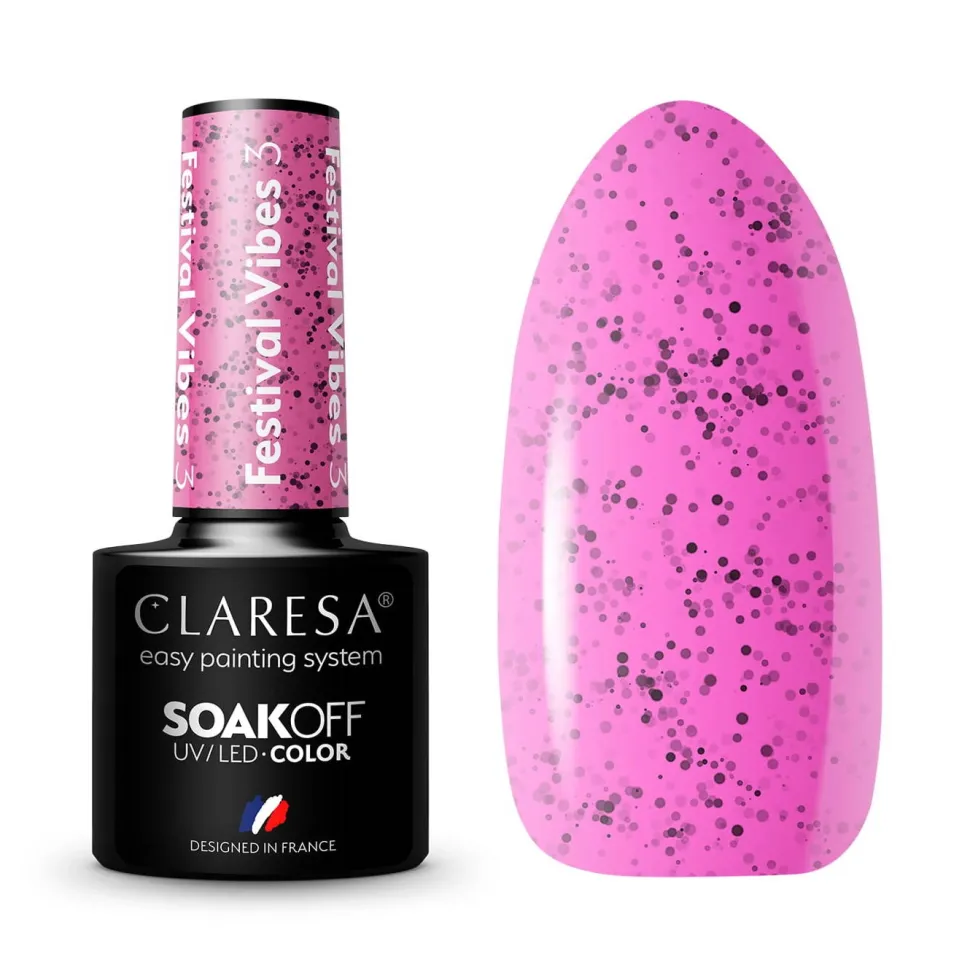 Propozycja od marki Claresa to Festival Vibes 3 – intensywny, różowy lakier hybrydowy z efektem czarnych drobinek. Zakochasz się w nim od pierwszego wejrzenia.