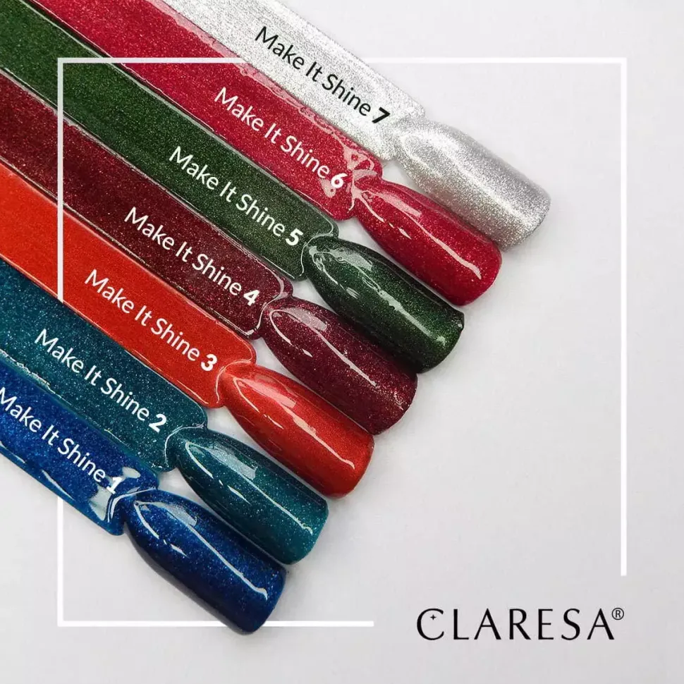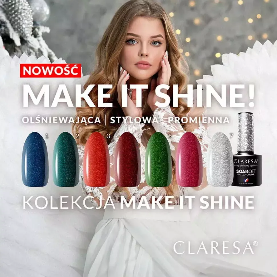 Granaty, brązy, pomarańcze, zielenie, czerwienie oraz srebro to kolory, które kojarzą się z okresem zimowo-świątecznym, dlatego stawiając na klasykę Claresa stworzyła kolekcję opartą o skojarzenia związane z tym magicznym okresem. Kolekcja Make It Shine! To 7 lakierów hybrydowych z mieniącymi się drobinkami, które doskonale sprawdzą się zarówno przy wigilijnym stole, na noworocznej imprezie, ale nie tylko. MAKE IT SHINE to wyjątkowe kolory z połyskującymi drobinkami, dzięki którym Twoje paznokcie będą po prostu olśniewające kiedy tylko zechcesz!