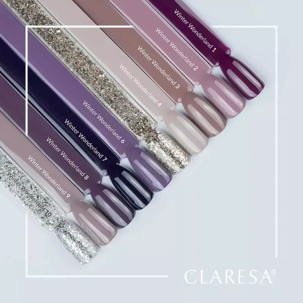 Kolekcja Winter Wonderland marki Claresa to zestawienie 8 pięknych, zimowych barw w odcieniach fioletu, szarości, beżu i brązu. Dodatkowo w kolekcji znajdziesz 2 kolory z dużymi, brokatowymi drobinami. Twórz wyjątkowe stylizacje w delikatnym, stonowanym wydaniu lub szalej bez końca decydując się na świetliste, złote i srebrne elementy.