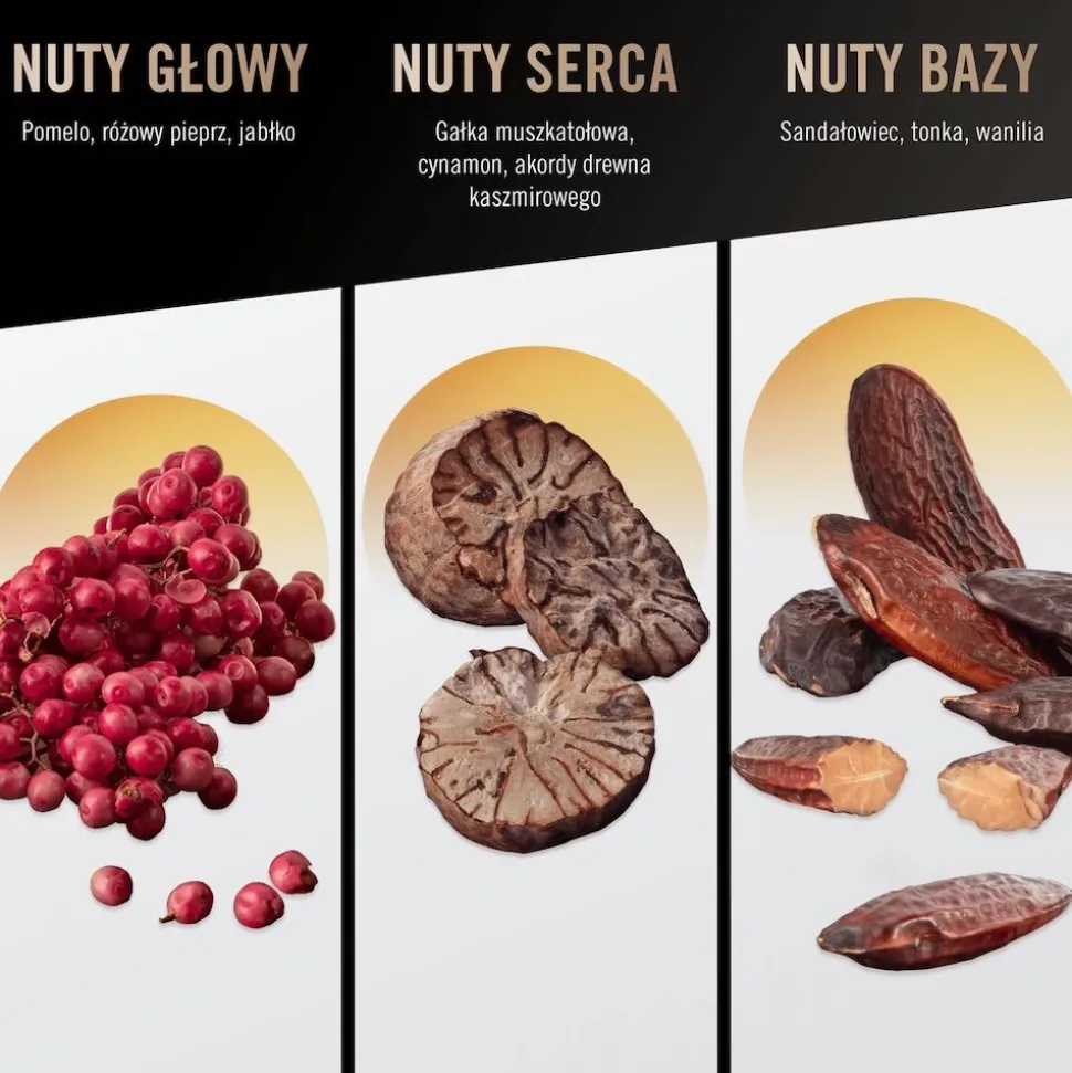 Kryjące się w intensywnej, głębokiej nucie bazy akcenty drzewa sandałowego przeplatają się z akordami wanilii; ocieplone są zmysłowym i eleganckim aromatem fasoli tonka.