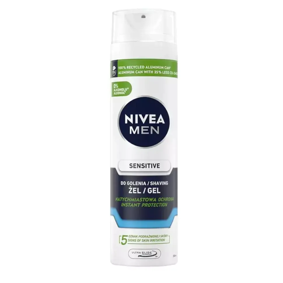 NIVEA MEN Łagodzący żel do golenia Sensitive z formułą bez alkoholu etylowego wzbogacona rumiankiem i witaminą E natychmiast chroni przed 5 oznakami podrażnionej goleniem skóry: pieczeniem, zaczerwienieniem, uczuciem napiętej i suchej skóry oraz mikro-zacięciami.