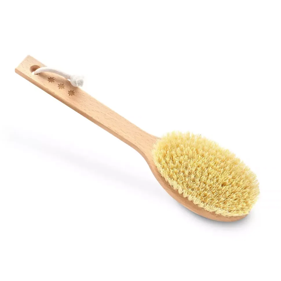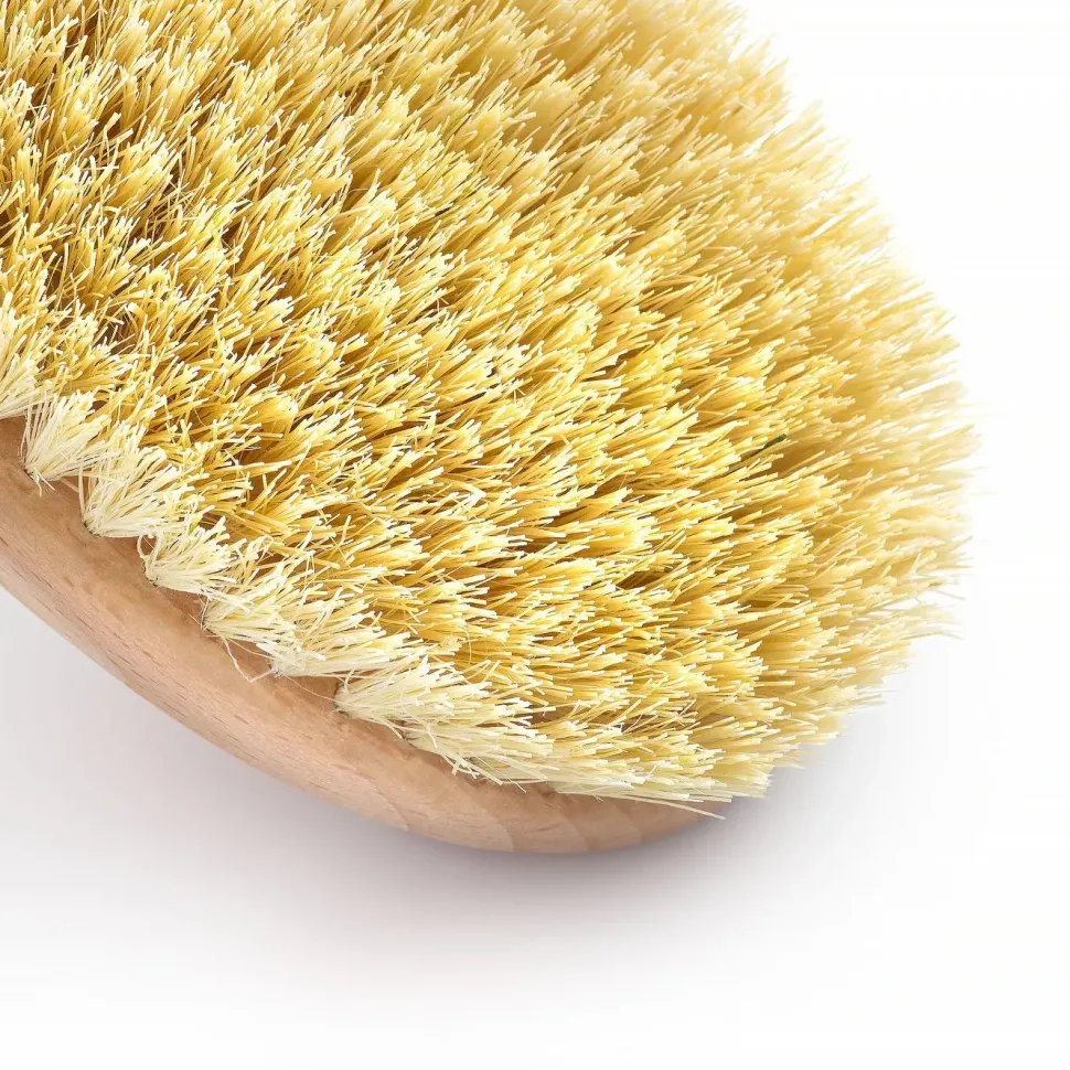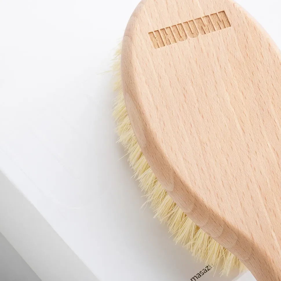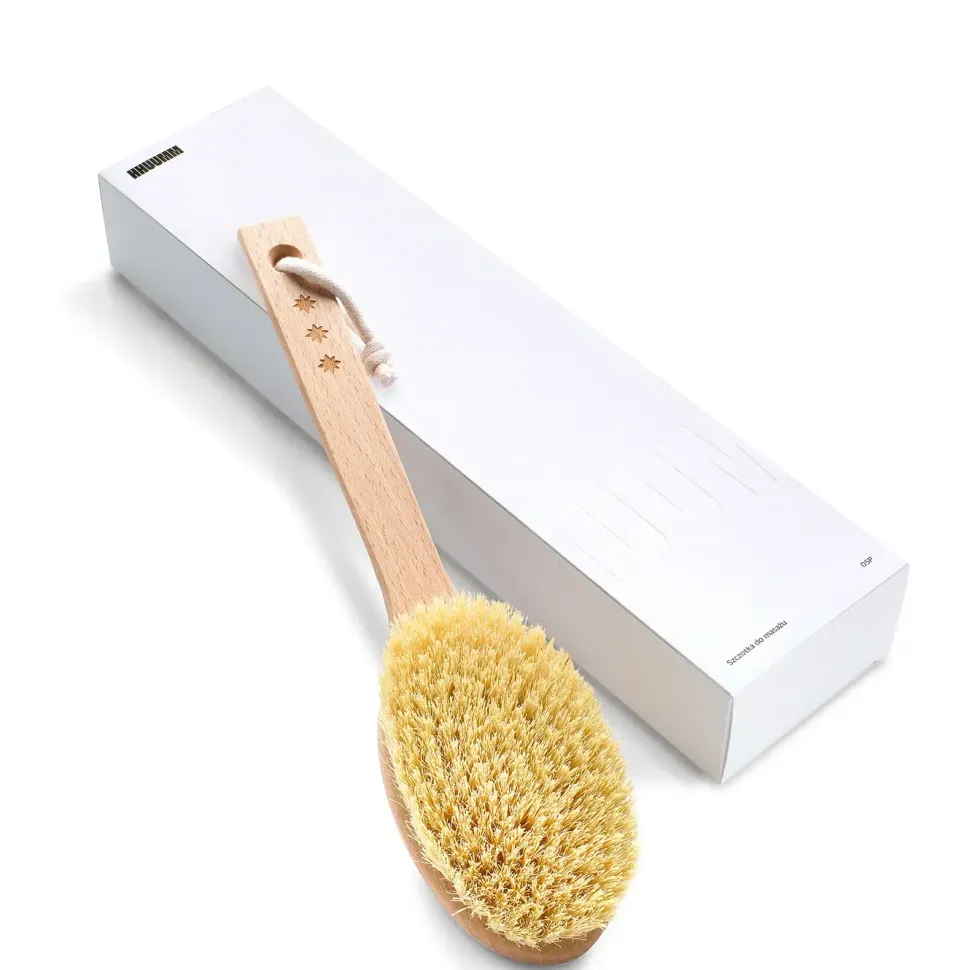 Szczotka do masażu ciała na sucho z odpinanym kijem, który ułatwi masaż pleców i trudno dostępnych miejsc na ciele.Wykonana metodą rzemieślniczą z naturalnego, olejowanego drewna bukowego.Ręcznie gęsto nabita naturalnym włóknem kaktusa agawy. Bawełniany uchwyt na dłoń ułatwia wykonywanie precyzyjnych ruchów.