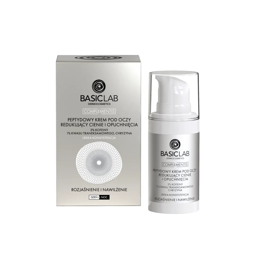 Peptydowy krem pod oczy redukujący cienie i opuchnięcia ma działanie rozświetlające i nadające świeżego wyglądu okolicom oczu. W swoim składzie łączy peptyd Argireline™, 3% kofeiny oraz aminokwas w postaci kwasu traneksamowego, które przywracają witalność, nawilżają i poprawiają kondycję delikatnej skóry. Krem przeciwdziała cieniom i opuchnięciom, wygładzając okolicę pod oczami. Delikatna formuła pozwala na użycie produktu również na powieki. To komplementarny produkt, który domyka rutynę pielęgnacyjną, tworząc zgrany duet z serami pod oczy z gamy Esteticus. Przeznaczony do stosowania na dzień i/lub na noc..