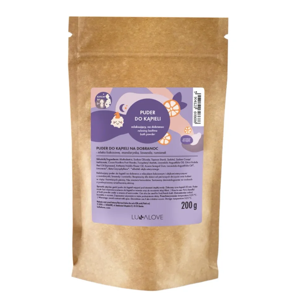 Relaksujący puder do kąpieli z olejkami eterycznymi z mandarynki, rumianku i lawendy. Może być stosowany w niemowląt. Jest niezwykle delikatny dla skóry, a dodatek mleka kokosowego oraz soli bochneris działa pielęgnująco na skórę. Taka kąpiel relaksuje i odpręża. Jest doskonałym elementem wyciszającej rutyny przed snem.