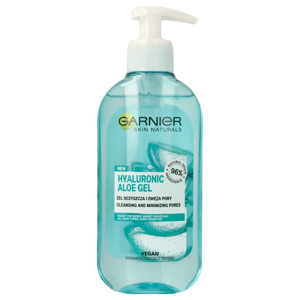 Aloe Żel oczyszczający i zwężający pory Aloes Świetnie sprawdzi się do oczyszczania każdego typu skóry nawet tej wrażliwej. Żel posiada w swoim składzie organiczny aloes oraz kwas hialuronowy, doskonale nawilża oraz regeneruje skórę. GARNIER HYALURONIC ALOE ŻEL skutecznie usuwa nadmiar sebum oraz sprawia, że pory są mniej widoczne, pozostawia skórę oczyszczoną, świeżą i miękką.