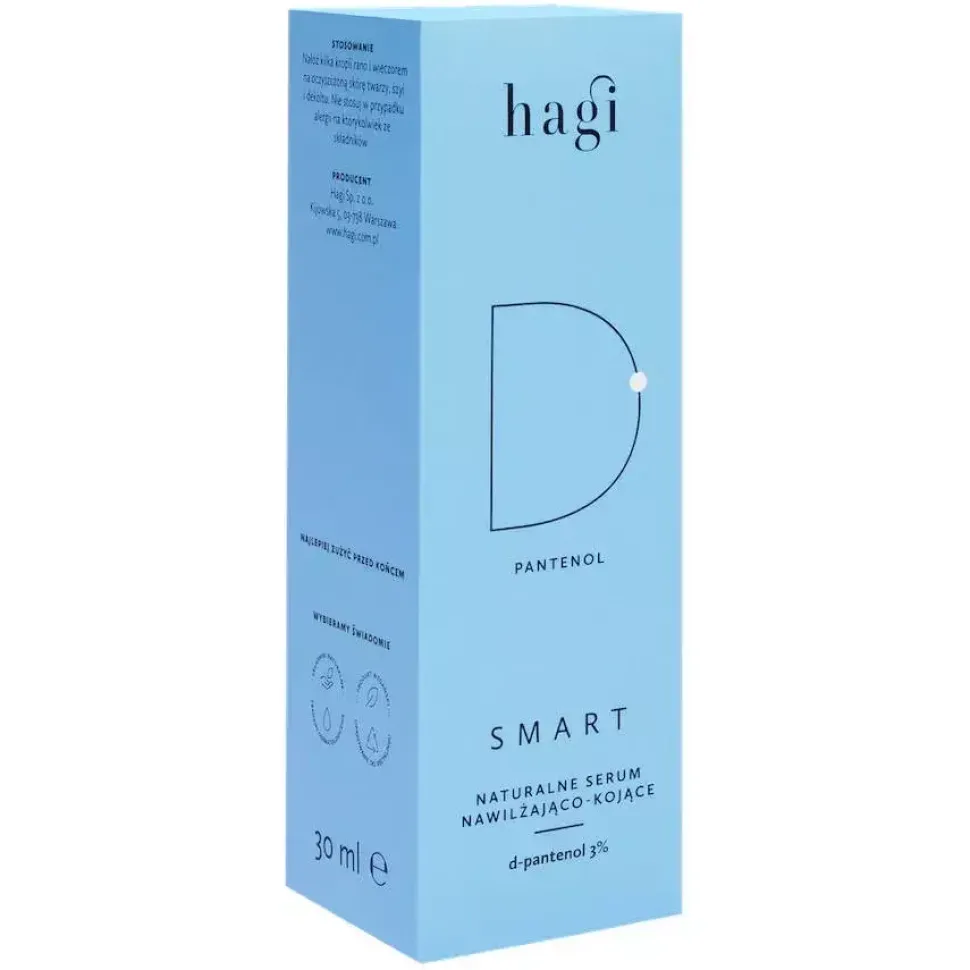 Serum do twarzy z 3% d-pantenolem Hagi SMART to kompozycja zaawansowanych składników nawilżających i kojących dla skóry suchej, odwodnionej, a także wrażliwej. Prowitamina B5 (d-pantenol) to składnik łagodzący uszkodzenia płaszcza hydrolipidowego, a betaglukan odbudowuje jego strukturę. Zawartość alphaglukanu wspiera naturalną pracę mikrobiomu skóry. Kompleks roślinny zabezpiecza skórę przed utratą wody z naskórka.