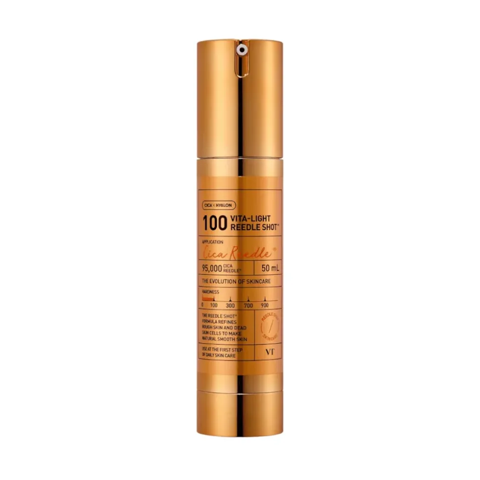 VT Cosmetics – Vita-Light Reedle Shot 100 to innowacyjny zabieg na skórę, który łączy technologię mikroigieł z rozświetlającymi składnikami, aby nadać skórze bardziej jednolity ton i poprawić jej strukturę. Dzięki opatentowanym cząsteczkom przypominającym mikroigły (Hydrolyzed Sponge) aktywne składniki wnikają głębiej w skórę, stymulując odnowę komórkową – idealne dla osób chcących zredukować nierówny koloryt skóry i przebarwienia.