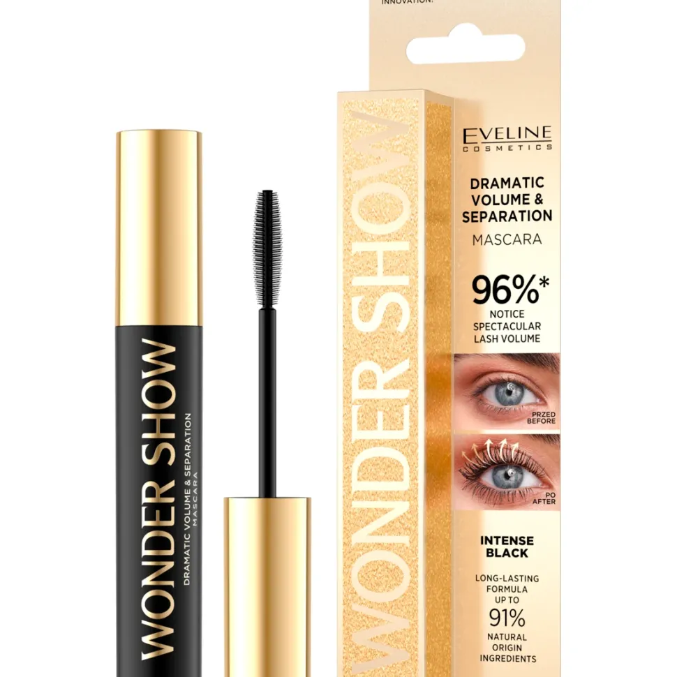 Innowacyjna konsystencja tuszu Wonder Show przypominająca lateks w połączeniu z elastycznymi polimerami zapewnia doskonałe pokrycie oraz umożliwia budowanie spektakularnej objętości rzęs. Wyjątkowa formuła masy w połączeniu z precyzyjną silikonową szczoteczką o klasycznym kształcie, doskonale aplikuje się na rzęsy, pokrywając je od nasady aż po same końce.