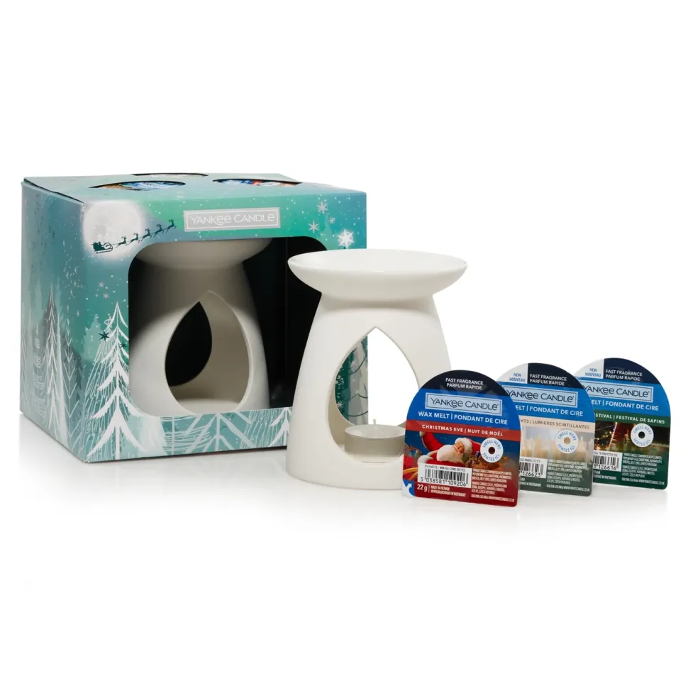 W zestawie: 1 x wosk Twinkling Lights1 x wosk Christmas Eve1 x wosk Silver Sage & Pine1 x bezzapachowy tealight1 x kominek ceramiczny